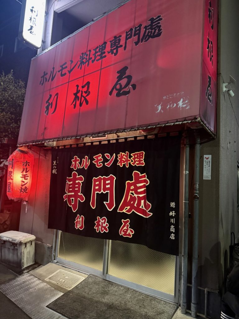 「利根屋」です。18時開始のお店なのですが、18時半に到着して、お店前に3人並んでいました。